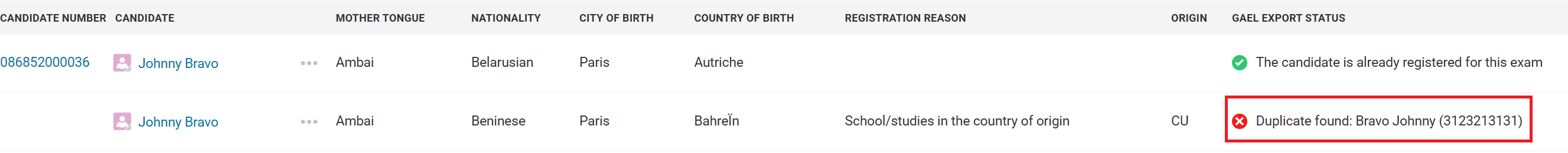 - If a candidate already exists in GAEL but doesn't have a Candidate Number in their Oncord profile, their registration will not be processed for export. In this case, a 'Duplicate found' status is generated. You must locate the candidate's Candidate Number within GAEL and manually add that in the Candidate Number field in the candidate's Oncord contact information.