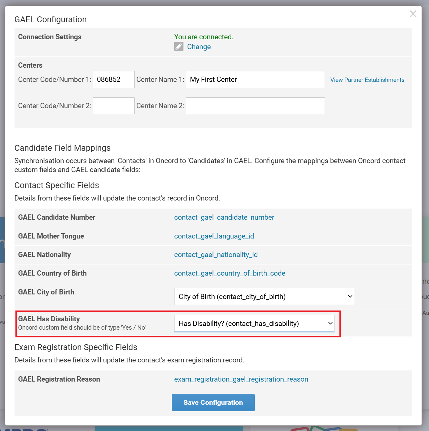 Click 'Save Configuration' when finished. The integration is now ready and any DELF/DALF exam you create in Oncord can push candidate data to GAEL with a single click.