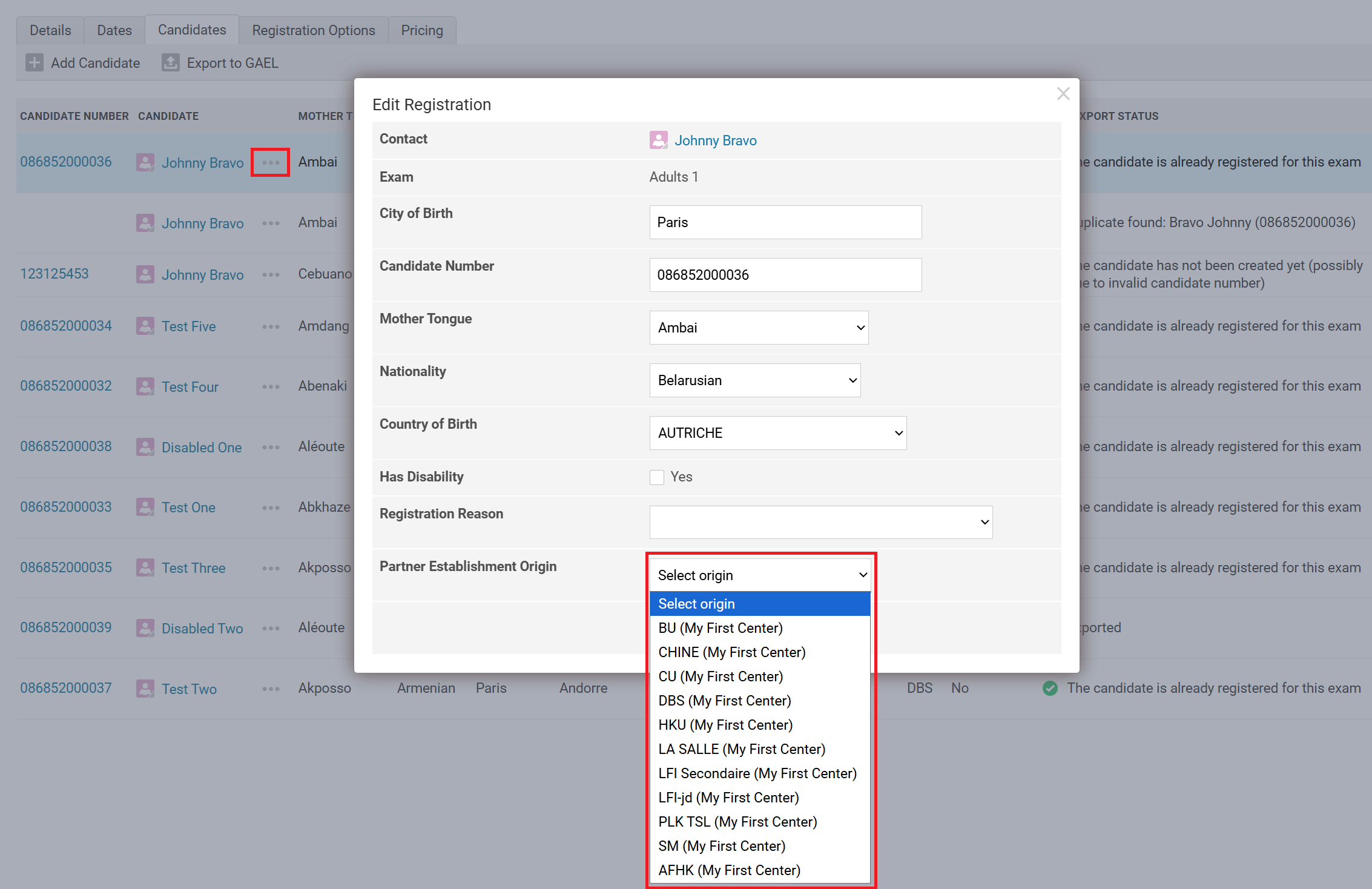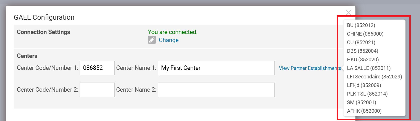 When you add a center in GAEL Configuration, its partner establishments are fetched automatically and appear as choices when editing a registration. This allows for recording of the candidate's origin in GAEL.