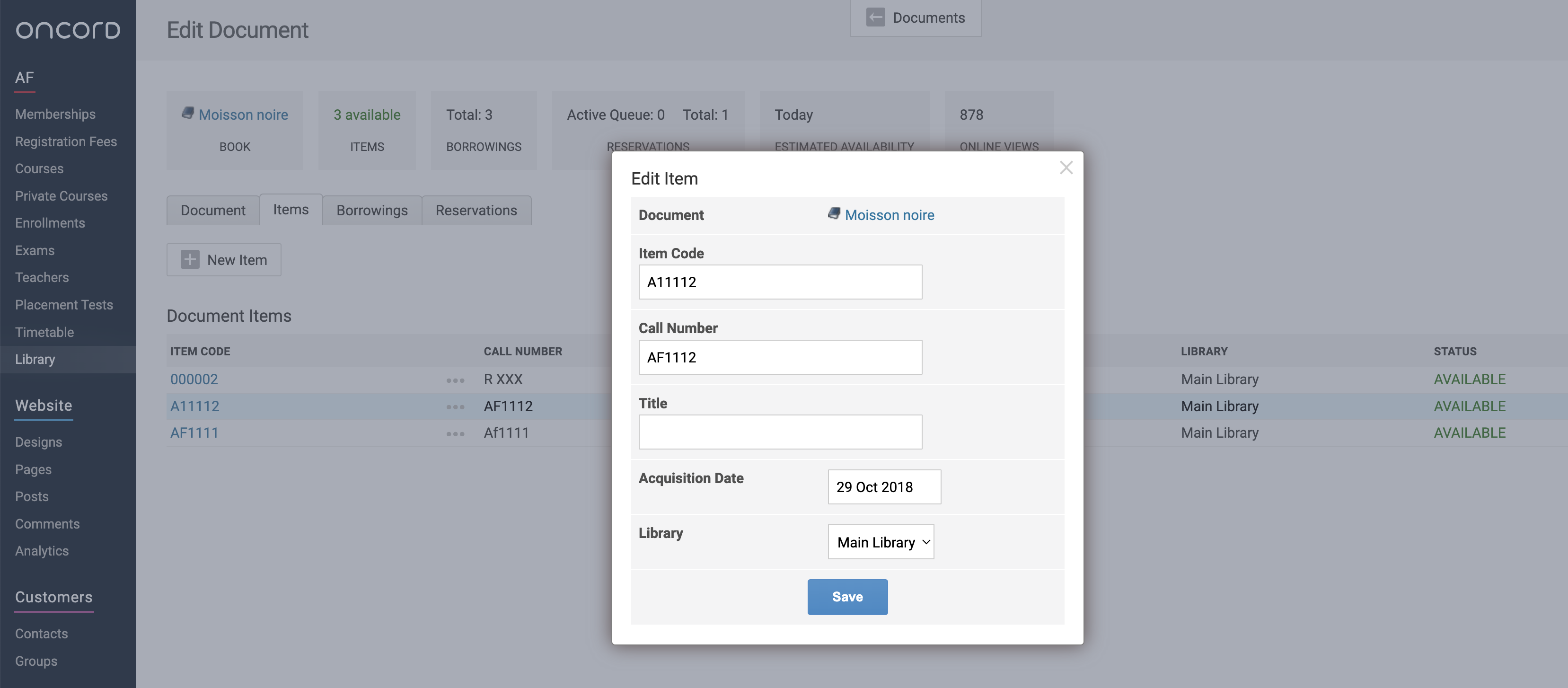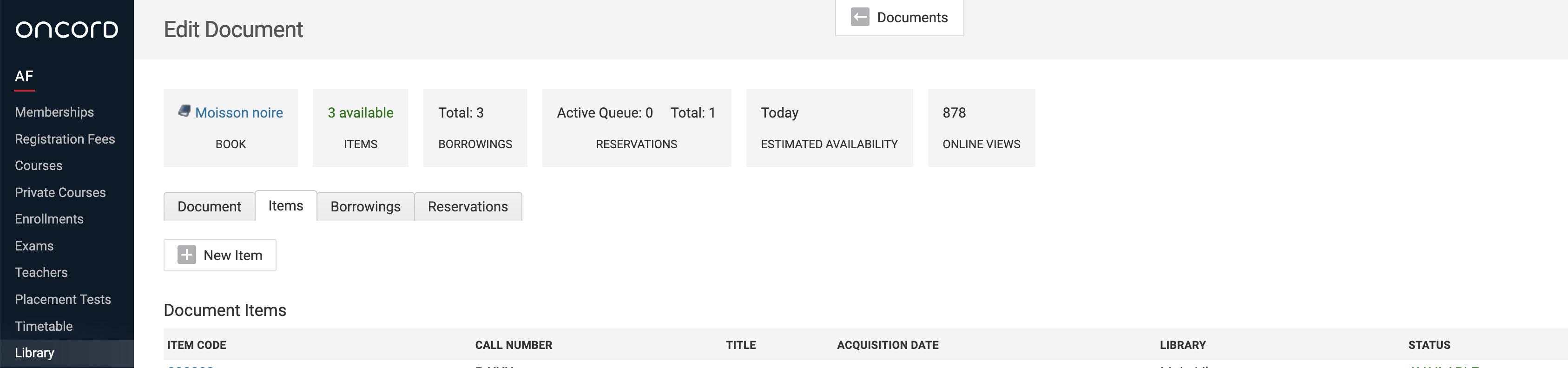 Repeat this for each copy of the document you have available in your library - If you have 3 copies of a book, add 3 items, one for each copy so that you can track each copy individually, this also allows multiple students to borrow the same document at the same time if you have multiple copies.