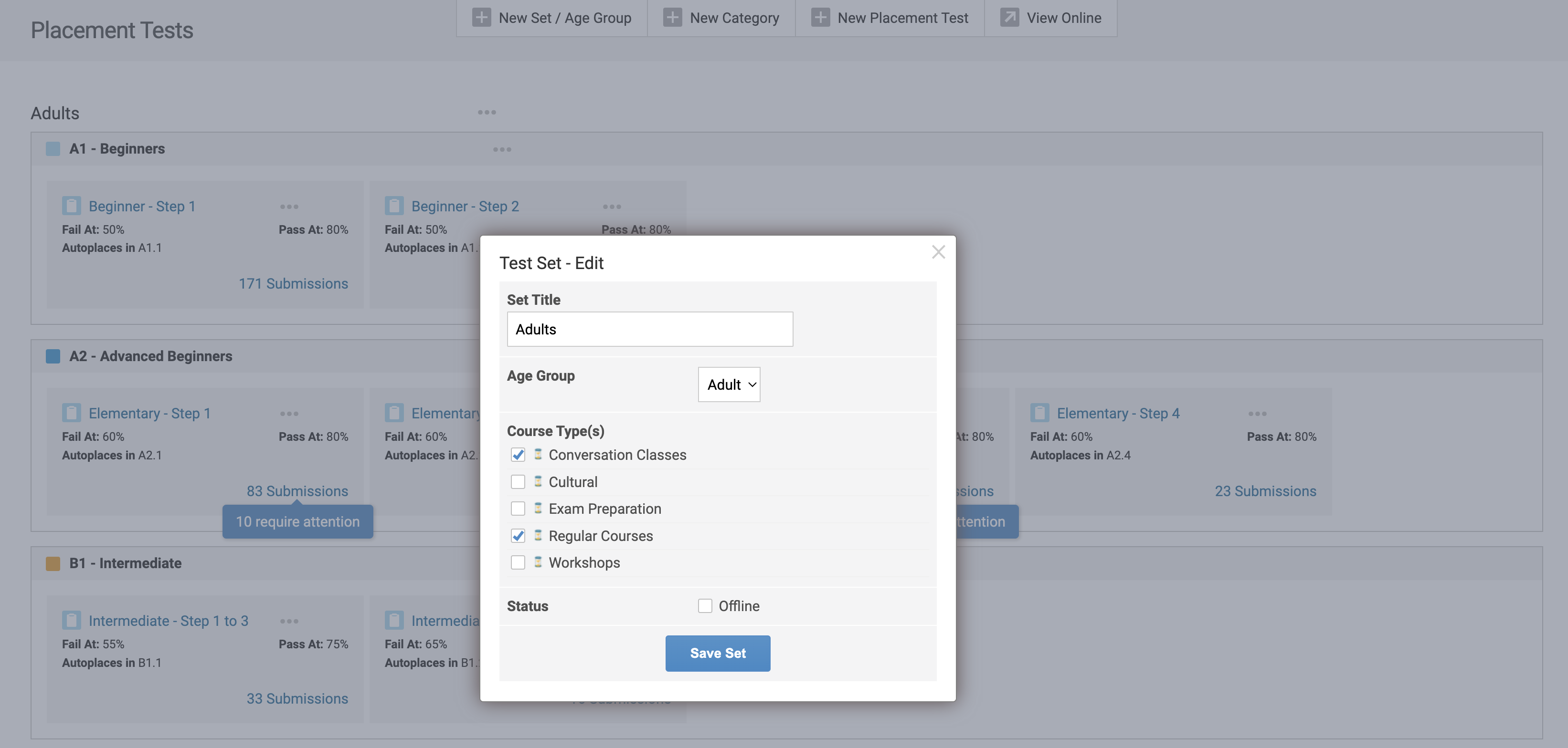 Once the set/age groups you require are created, you can then create categories for each of the levels (A1, A2, B1, B2, C1, C2, Conversation).