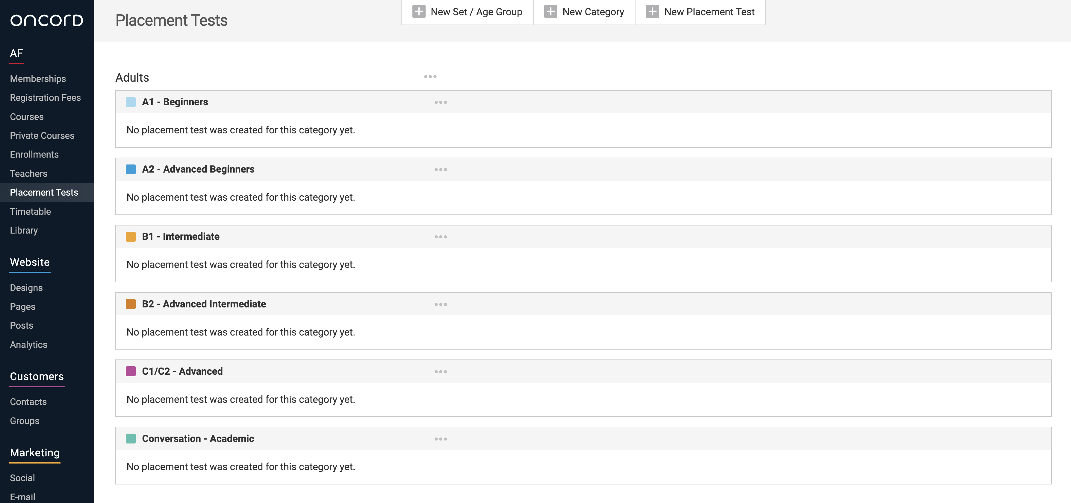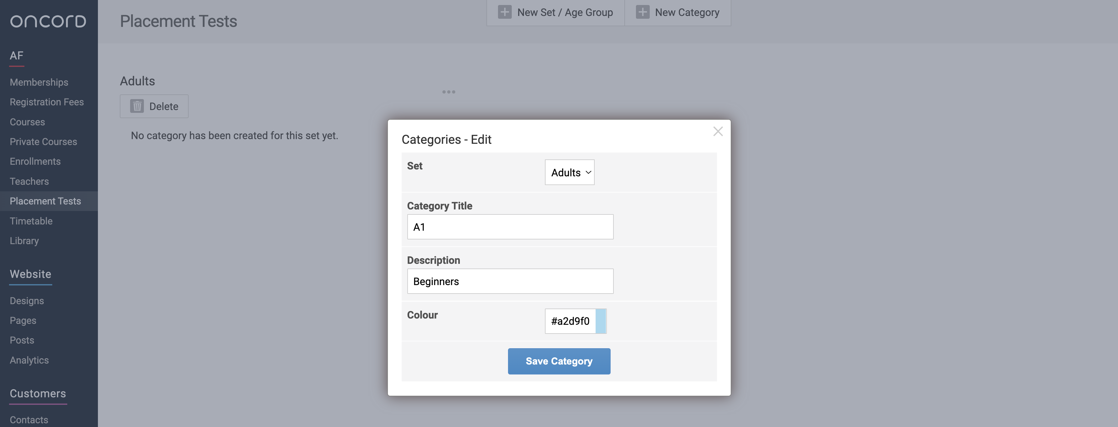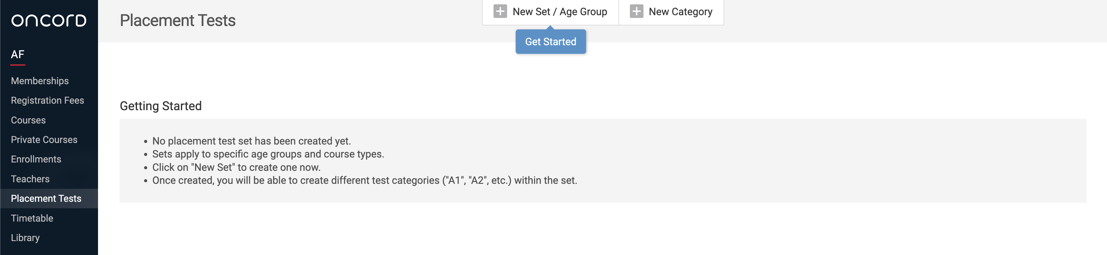 Before creating your placement tests, first you need to setup the configuration for placement tests, this includes age groups and categories for each level. This article covers what the configuration settings are and how to set them up within your Oncord account.