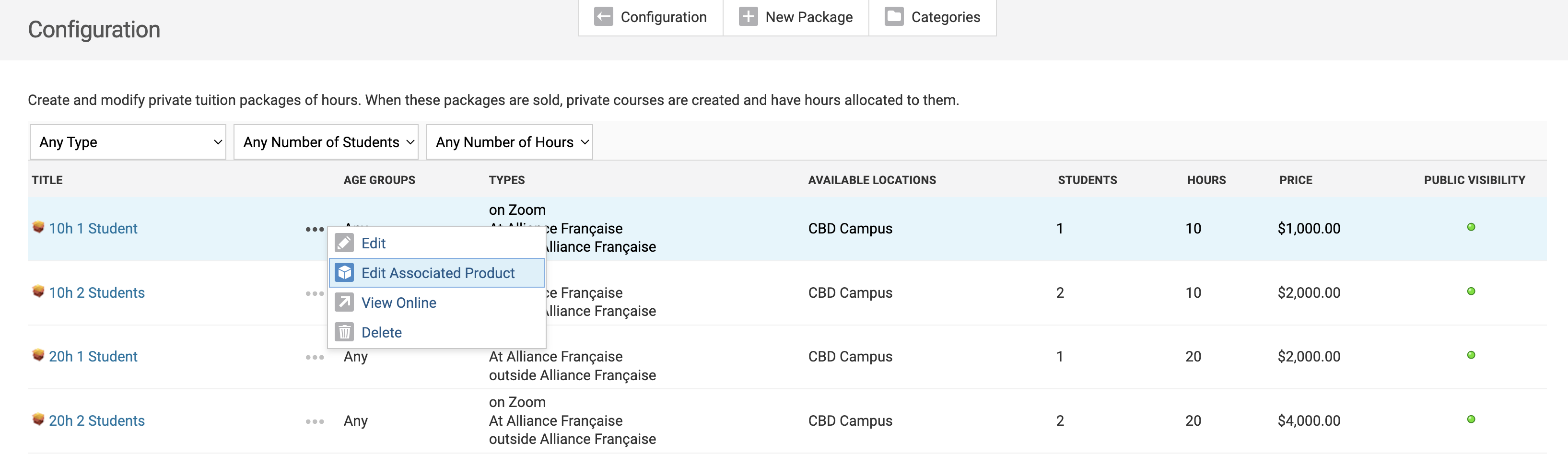 From the Private Course Packages page click on the 3 dots next to a package that you want to set to recurring and select "edit associated product"