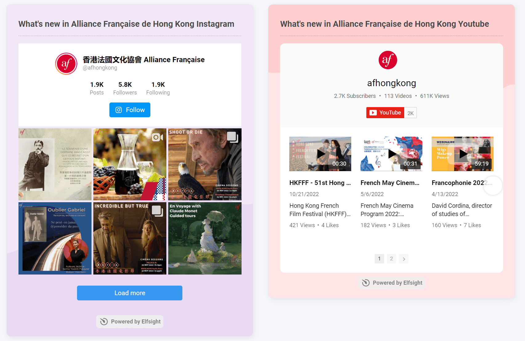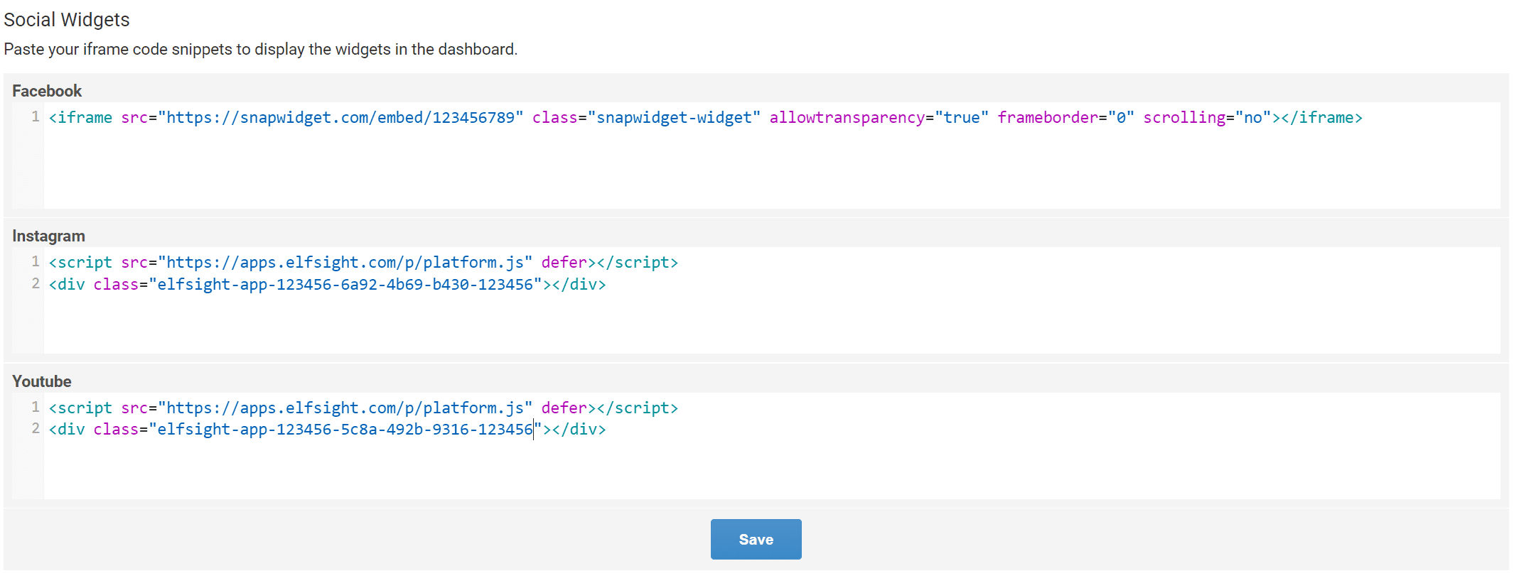 The configuration page for the socials widget can receive 3(one for facebook, instagram or youtube) separate embed codes from different