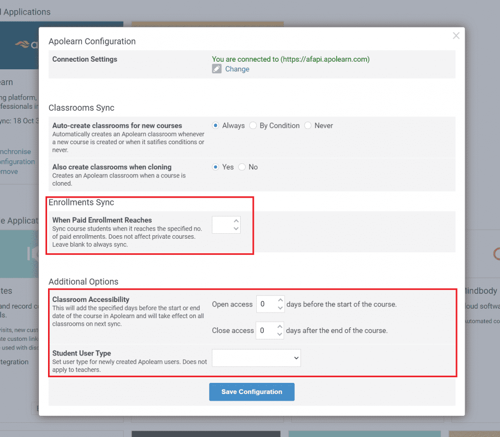 When Paid Enrollment Reaches Option - Only sync the course to Apolearn when the number of paid enrollment is reached for a course. Will always sync when no number is specified.