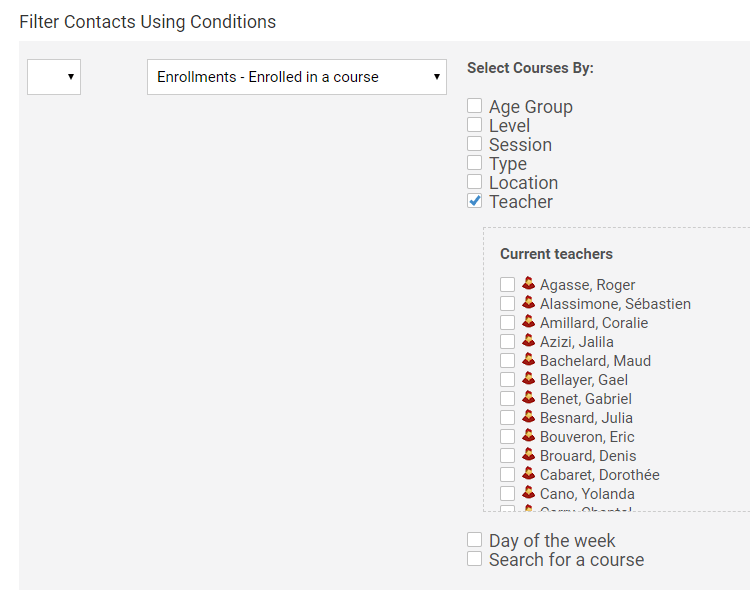 Enrollment's Teacher Filter This new filter is added in enrollment's statistics and for condition filter Enrollments - Enrolled in a course and Enrollments - Absent in a course