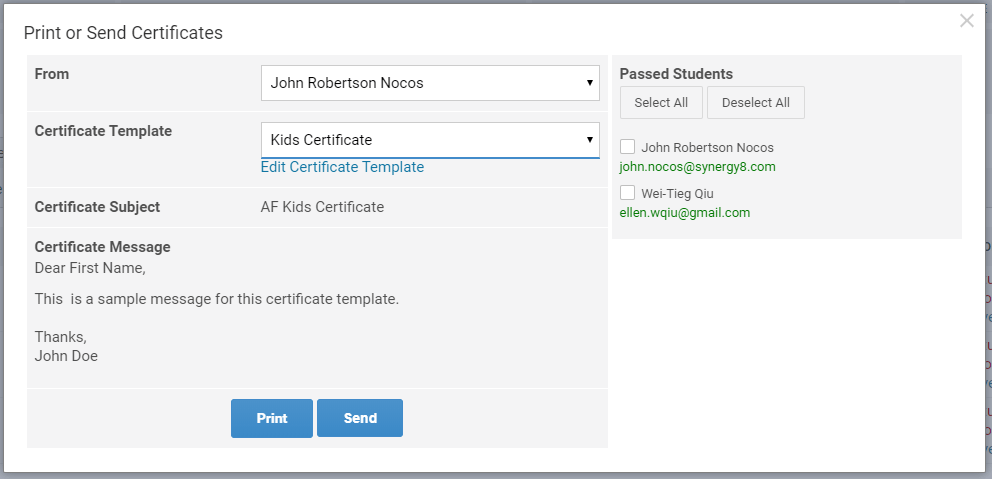 A new Certificates button is added under Courses > Class List which offers the ability to print or send different